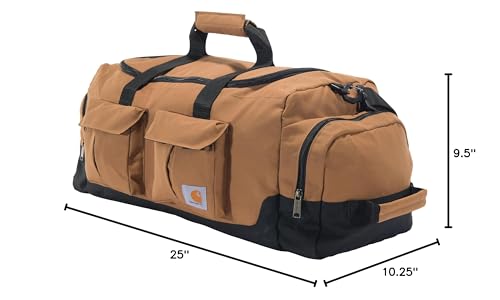 Details: Description Everday Duffel bag built Carhartt strong crafted to accompany you on the jobsite, the gym, and overnight excursion. 600 denier polyester with Rain Defender durable water repellent, durable fabric keeps all your valuables dry and secure. Bag features U-shaped zippered opening into large main compartment, two front pockets with flap closure, two zippered end compartments, large rear exterior zippered pocket, Ten interior mesh pockets, padded top and side haul handles, removable, adjustable shoulder strap providing comfort and versatility. 25” X 10.25” X 9.5” dimensions.