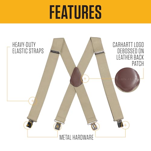 Details: Two inch heavy duty elastic suspender straps with contrast color stripe down the center, heavy duty metal clips, metal strap length adjuster, Carhartt logo debussed on leather back patch
