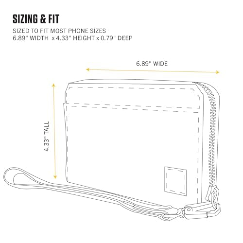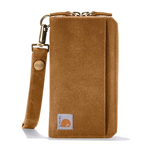 Details: Description Large enough to fit most phones, this Carhartt clutch wallet could take the place of a bag if you're the type who packs light. The minimalist design makes it well-suited as an everyday piece or a weekend go-to. It's rugged and water-resistant, so it can handle being thrown around on the job or splashed with a spilled drink.
