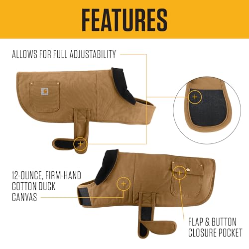 Details: The Carhartt Firm Duck Insulated Dog Chore Coat is built for the toughest pups. Made with durable firm-hand duck canvas, this waterproof dog coat provides exceptional protection in wet, windy, and cold conditions. The water-repellent exterior shields your dog from the elements, while the dog jacket's quilted liner and corduroy collar ensure warmth and comfort during outdoor adventures. The new vent in the collar offers easy access and extra breathability. Designed for ease of use, improved neck and chest tabs allow for quick on and off, and the loop-lined straps provide a fully adjustable fit for maximum comfort. This durable weather-resistant coat is perfect for active dogs who need reliable protection from the cold, rain, and wind. Whether you're walking in the snow or braving a rainy day, the Carhartt Firm Duck Insulated Dog Chore Coat ensures your dog stays dry, warm, and stylish. Available in sizes from small to large, it’s the ideal winter coat for your pup.