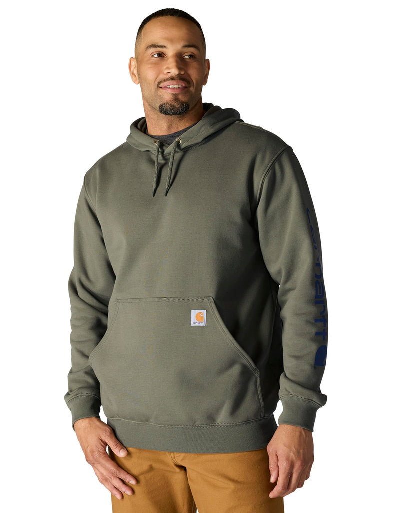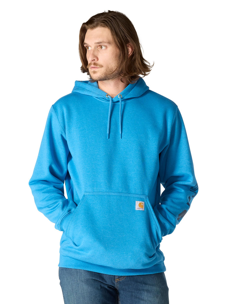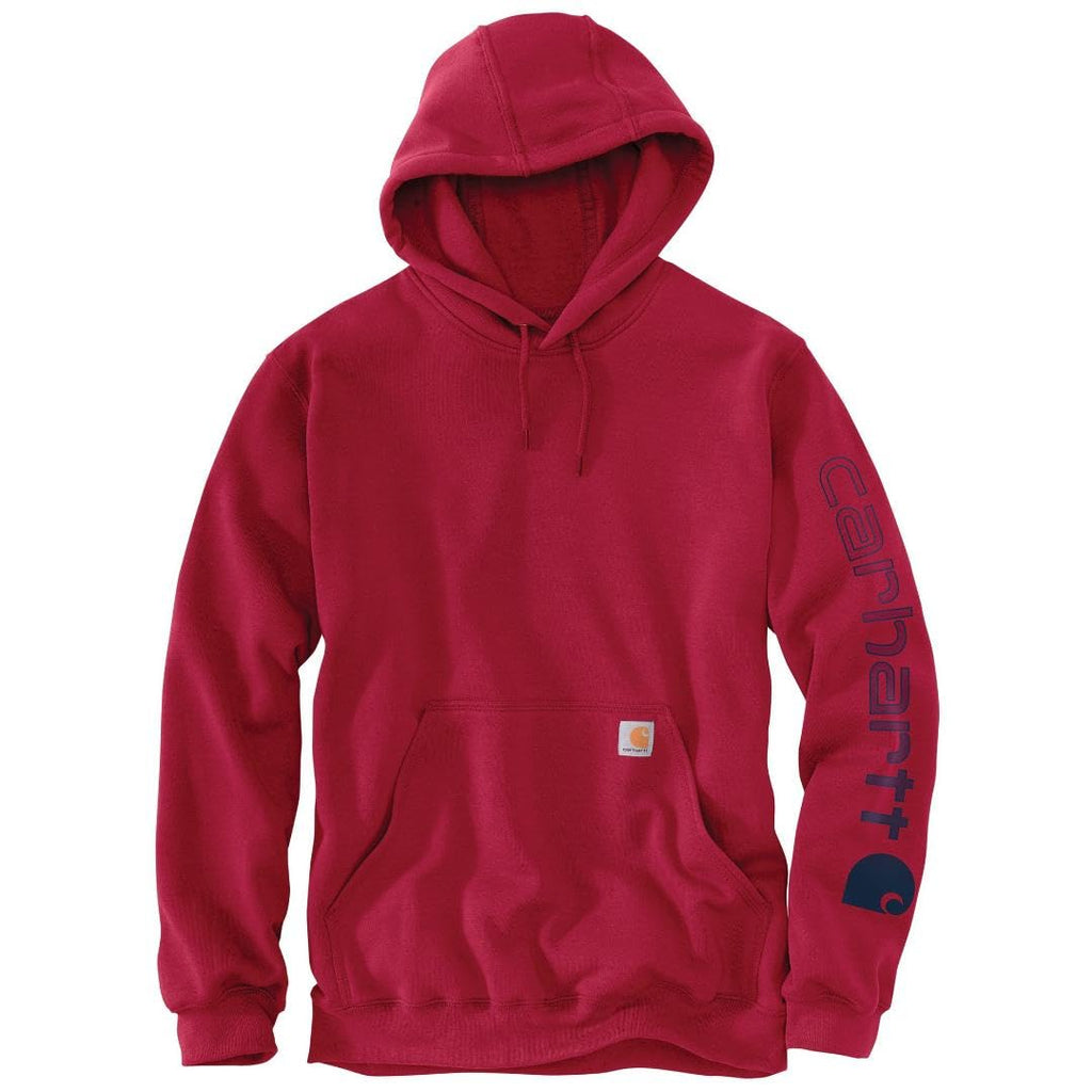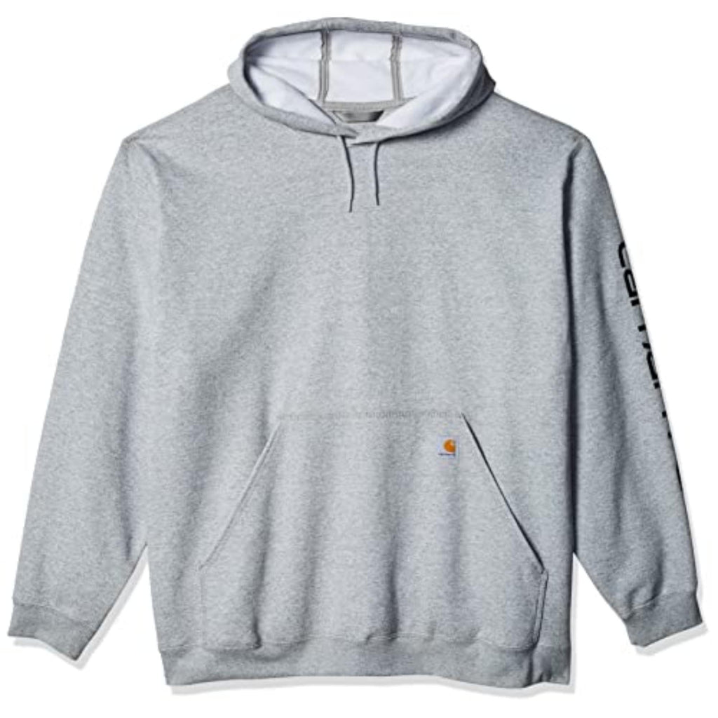 Details: Product Description Carhartt's midweight hooded logo-sleeve sweatshirt comes in great colors. Made of a 10.5-ounce, 50% cotton/50% polyester blend, it features an attached hood with draw-cord closure, front hand-warmer pocket, spandex-reinforced rib-knit cuffs and waistband. The carhartt logo is printed on the sleeve and a logo patch is sewn on the pocket. Product Care:Machine wash cold with like colors, Do not bleach, Tumble dry low remove promptly, Do not iron ornamentation From the Manufacturer Our midweight hooded logo-sleeve sweatshirt comes in great colors. Made of a 10.5-ounce, 50% cotton/50% polyester blend, it features an attached hood with draw-cord closure, front hand-warmer pocket, spandex-reinforced rib-knit cuffs and waistband. The Carhartt logo is printed on the sleeve and a logo patch is sewn on the pocket.