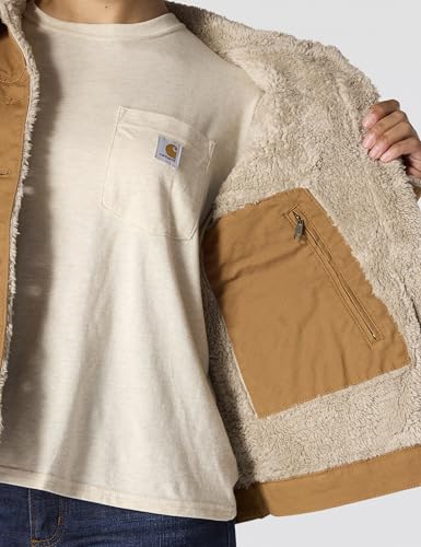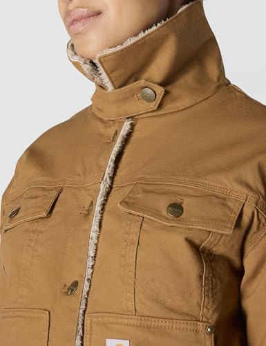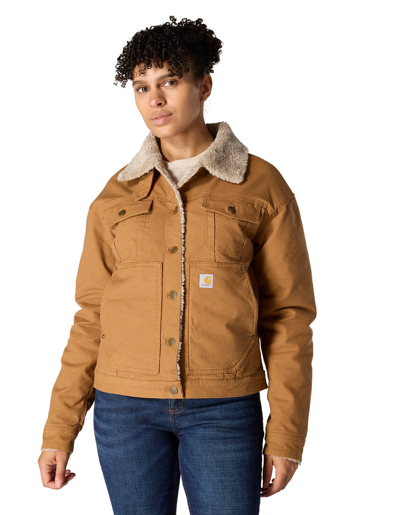 Details: Description Withstand cold weather in this women's Carhartt jacket. It's lined with soft sherpa fleece for a warm and comfortable feel. Rugged canvas duck has built-in flex so you can lift and stretch without restriction. A loose fit gives you plenty of room to move.