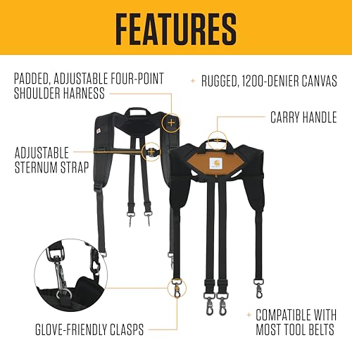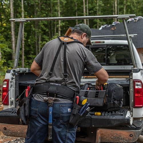 Details: Build a custom tool belt. Carhartt's Station Tool System features modular designs that allow you to personalize jobsite storage to your needs. With soft foam padding and lumbar support, this belt keeps you comfortable on long shifts. Storage includes adjustable, detachable pockets, designated storage for drill bits, a reinforced pocket for sharp items, and a tape measure clip. Designed for all-day comfort, the EVA foam–padded waist belt provides lumbar support to help reduce strain during long hours on the job. Adjustable and detachable pockets made with double-layer fabric allow you to customize your setup, while compatibility with the Carhartt Station Tool Belt Suspender and Station Tool Pouches lets you expand and adapt your system as needed.