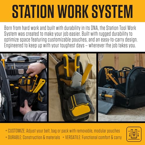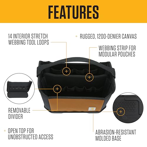 Details: All your tools in sight and easy to grab. This large tote bag is part of Carhartt's Station Tool System, with a modular design that lets you build a custom tool bag to your needs. It comes with 14 tool loops plus an outer pocket. Use it with the removable divider, or turn it into a dump bag. Movable pouches are not included but can be easily added to the bag when purchased separately.