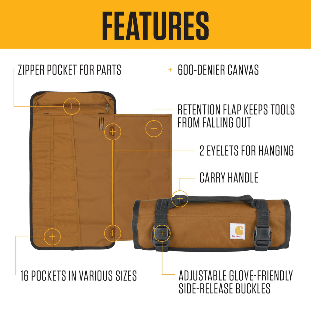 Details: Versatile and easy to use, the Carhartt Utility Roll Organizer is a simple storage solution — whatever the tools of your trade. It comes with glove-friendly buckles and standard-sized grommets. We added a flap on the side to keep tools secure when rolled up. Stash small items like drill bits into the handy zipper pocket.