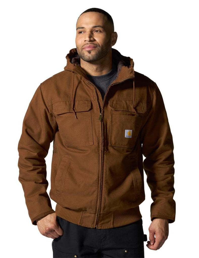 Details: Description Insulated for warmth and broken in for easy movement. This men's Carhartt duck canvas jacket is made for active work days in cold, windy weather. The 12-ounce canvas with reinforced cuffs delivers hard-wearing durability. Generous insulation throughout seals in warmth. A loose fit allows for easy layering and movement.