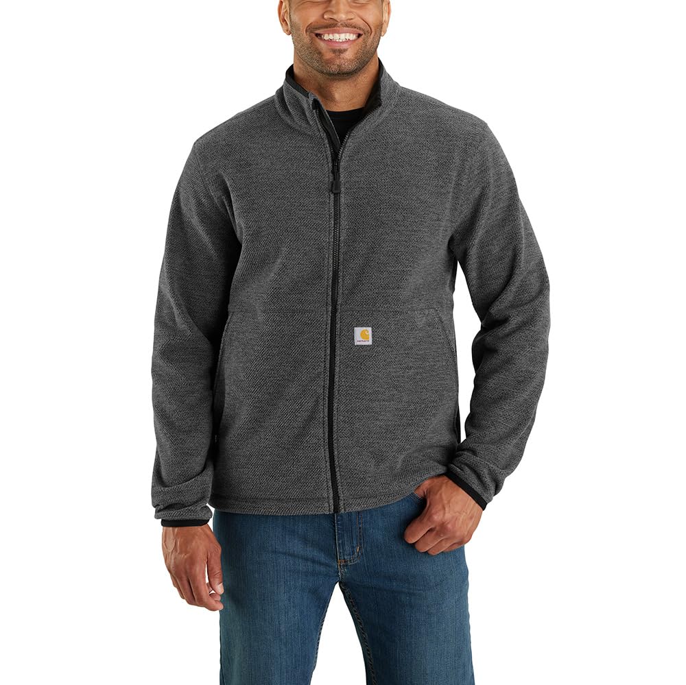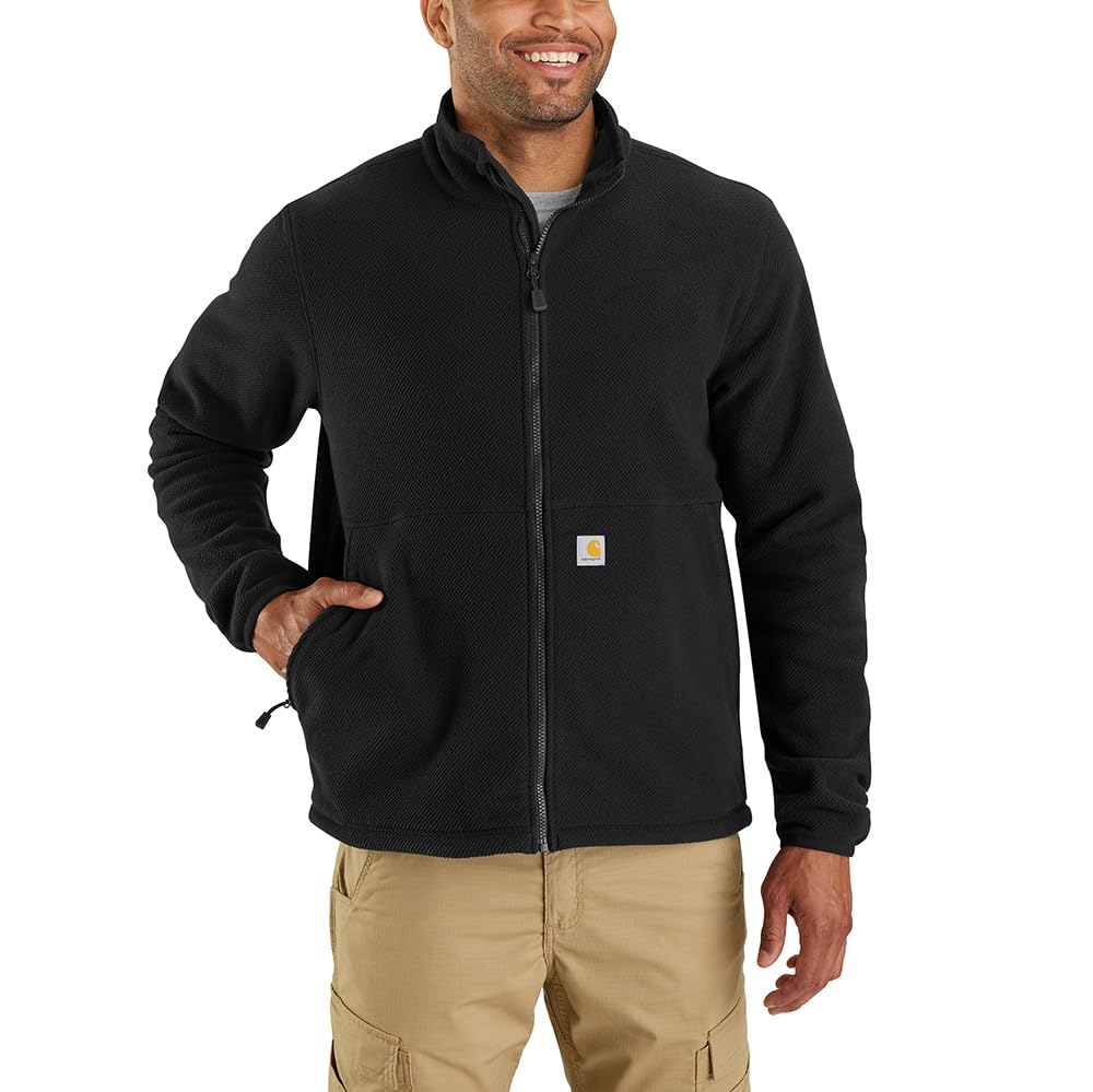 Details: Description A go-to layer for cool weather, this men's Carhartt fleece jacket is made in soft, textured fleece. It has a mock neck for extra coverage and elastic cuffs to help seal out cool air. A relaxed fit is easy to layer.