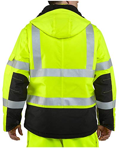 Details: Made of 250-denier, 100% polyester with a water-repellent finish and waterproof membrane, this jacket has a brushed polyester mesh lining. There are fully taped waterproof seams, two front utility bands at shoulder level. The right chest pocket has a flap and the left-chest pocket has a waterproof zipper closure. There a left-sleeve pocket and the sleeves include ergonomic openings with stretch-polyester storm cuffs. Back length: Large Regular: 30.75 inches. ANSI Class 3, Level 2 visibility standards 3M Scotch lite reflective material #8725. Meets ANSI/ISEA 107-2010. 250-denier, 100% polyester with a water-repellent finish and waterproof membrane 100% polyester mesh lining ANSI Class 3, Level 2 visibility standards 3M Scotch lite reflective material #8725