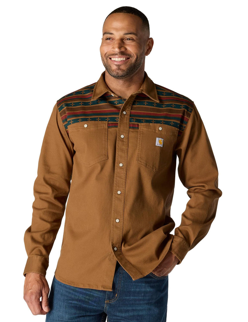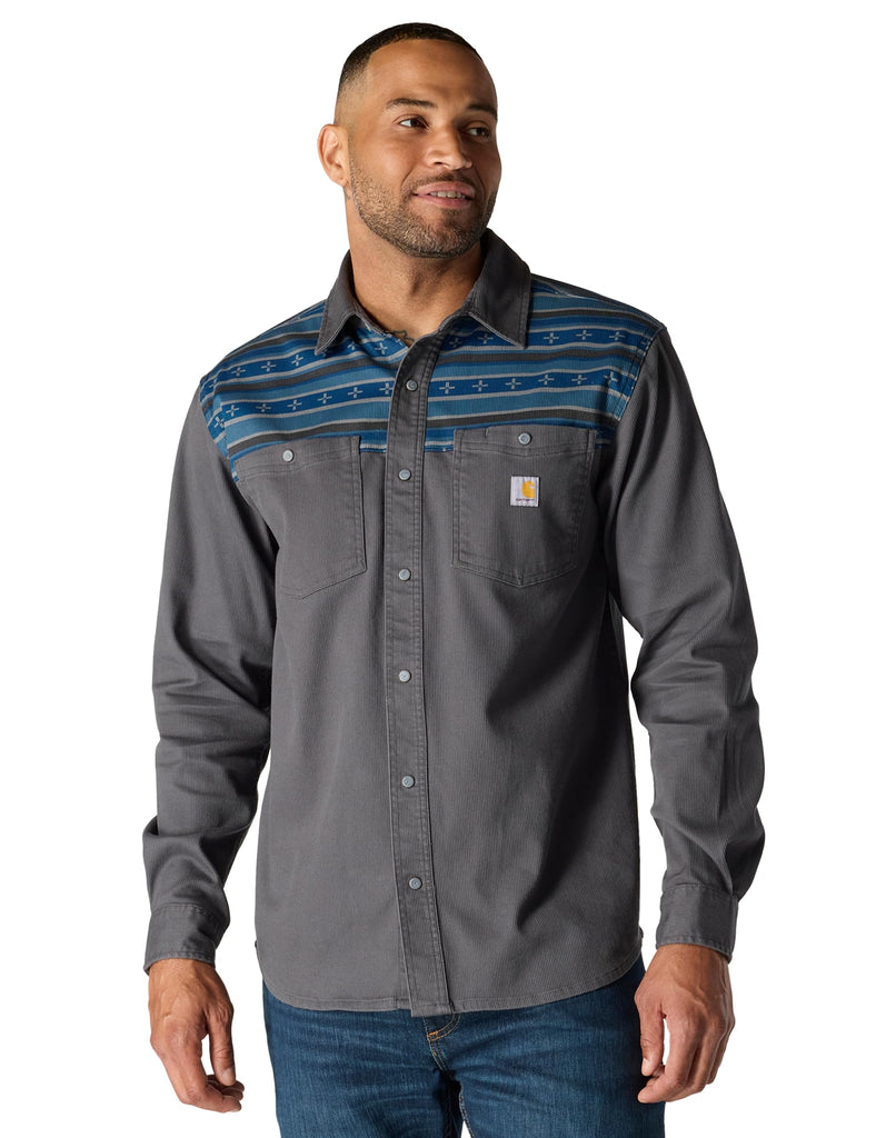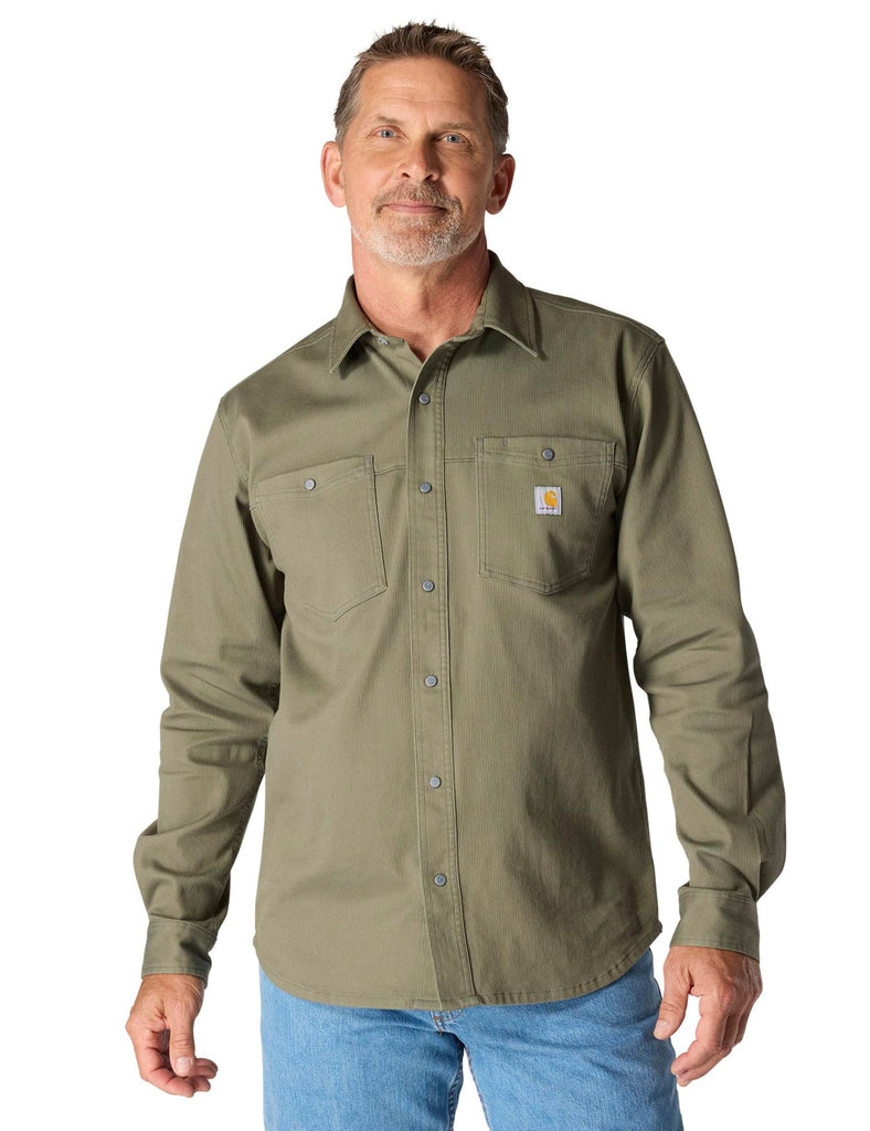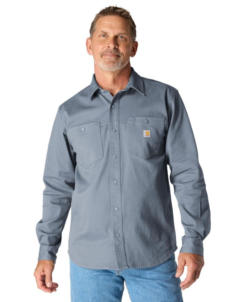 Details: Description Made for unrestricted movement and cut to be worn tucked or untucked, this men's Carhartt corduroy shirt features a heavyweight cotton blend with just the right amount of stretch. A relaxed fit offers a little extra room to bend and move.