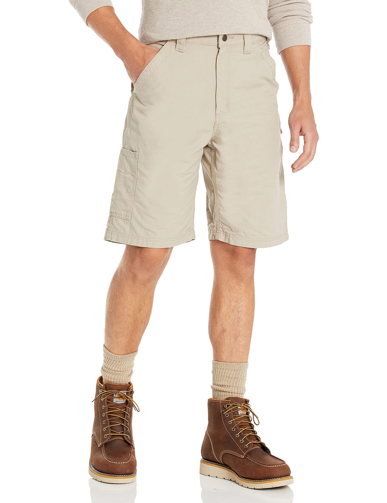 Details: Description An excellent lightweight choice, Carhartt canvas work short is made of 7.5-ounce, 100 percent cotton canvas work with a 10-inch inseam. The left leg features a hammer loop and ruler pocket, while the right leg includes a pocket for a cell phone or tools, plus a utility band. It also has extra wide belt loops. The back pockets feature reinforced seams.