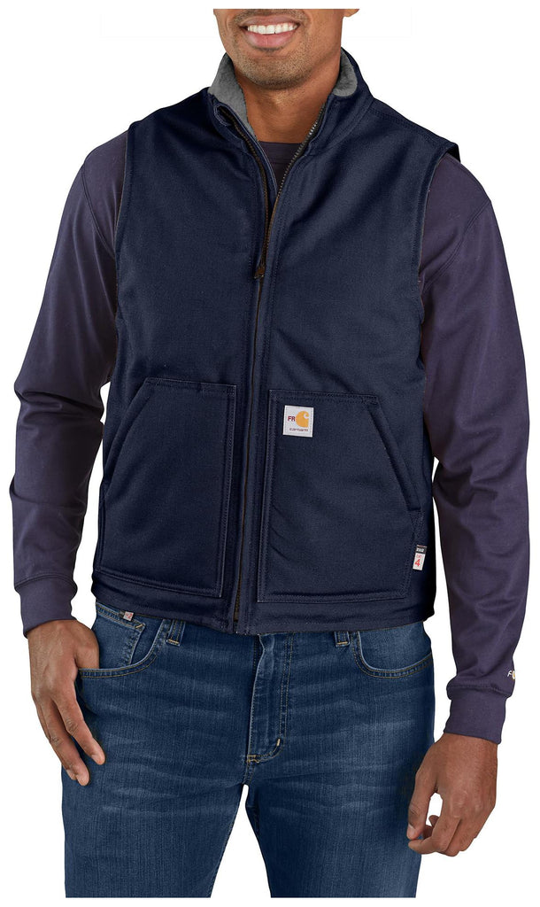Details: Description Designed to protect against arcs and flames, this men's Carhartt vest is made of flame-resistant canvas with a soft sherpa fleece lining. Sherpa-lined pockets keep hands warm, while inside pockets hold tools and supplies. 13-ounce, 100% cotton FR canvas. FR sherpa fleece lining for warmth. Meets the performance requirements of NFPA 70E. UL® classified to NFPA 2112.Vislon front zipper with Nomex® FR zipper tape. Inner storm flap and zipper garage at chin for electric-arc protection. Carhartt FR and NFPA 2112 / CAT 4 labels sewn on front-left pocket. Two large front pockets lined with FR sherpa for warmth. Two inside drop-in pockets. Droptail hem for added coverage. Imported