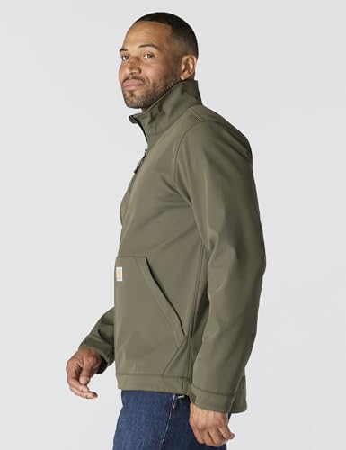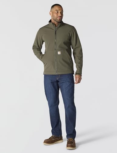Details: Description Keep working through gray, cloudy days. This men's Carhartt softshell jacket is made to repel light rain and fight off gusts of wind. It has built-in flex so you can move without restriction, and a mock-neck collar for a little extra coverage. A relaxed fit gives you room to move.