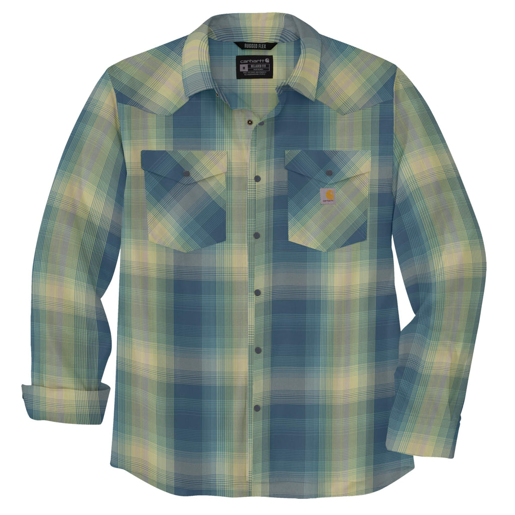 Details: Description Made for unrestricted movement and cut to be worn tucked or untucked, this men's Carhartt snap-front plaid shirt features a lightweight cotton blend with just the right amount of stretch. A relaxed fit offers a little extra room to bend and move.