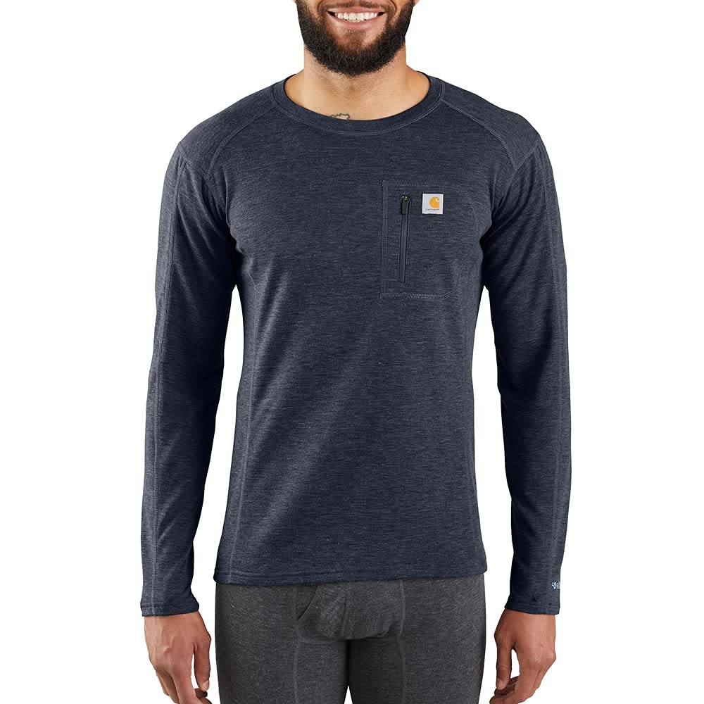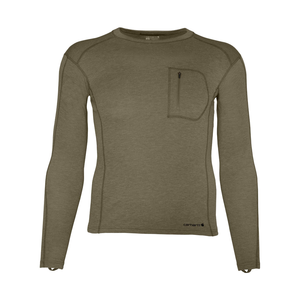 Details: Description Carhartt Men's Force Midweight Synthetic-Wool Blend Base Layer Crewneck Top with zippered chest pocket provides a comfotable layer of added warmth under shirts or jackets. Made with a temperature-regulating blend of polyester and merino wool, this long-sleeve, midweight base layer top helps retain heat in colder temperatures while working or recreating outside. Designed to wick sweat, dry fast, and fight odors, this men's underlayer helps keep you dry and comfortable during physical activities. Concealed thumb loops keep your sleeves in place when you put on another layer and locker loops make for an easy hang when not being worn. For increased comfort, Rugged Flex fabric technology lets the base layer top move with you, flatlock seams reduce chafing, and tagless labels are smooth against skin. From the job site to the campground, this men's versatile midweight crew offers easy-wearing warmth and looks good as a stand alone shirt.