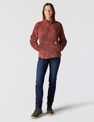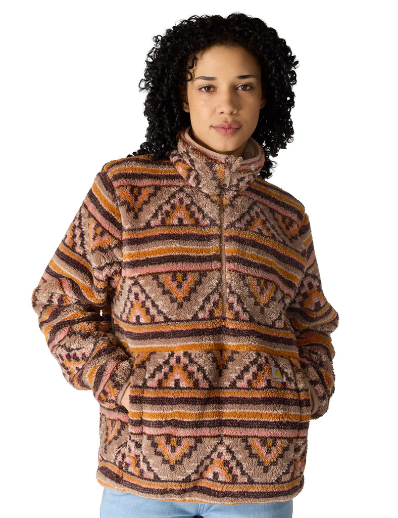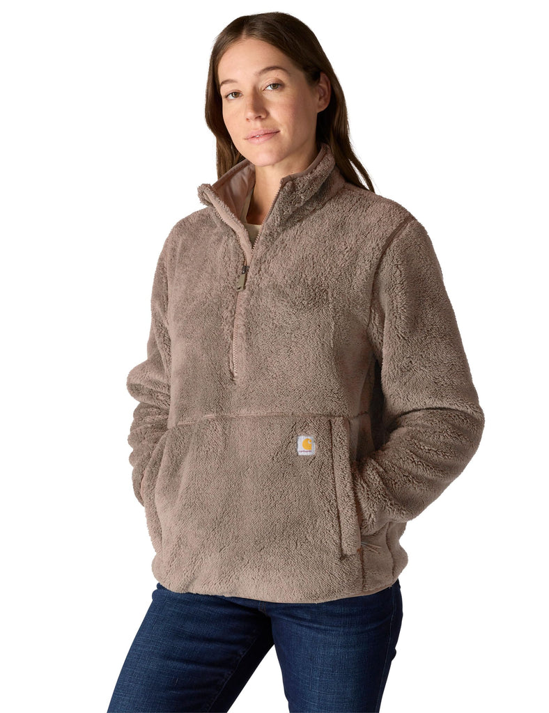 Details: Description Pull on this women's Carhartt fleece pullover when the temps drop. It has a loose fit that's made to layer. Elastic cuffs help seal out cold air, and zipper pockets keep work-day essentials secure.