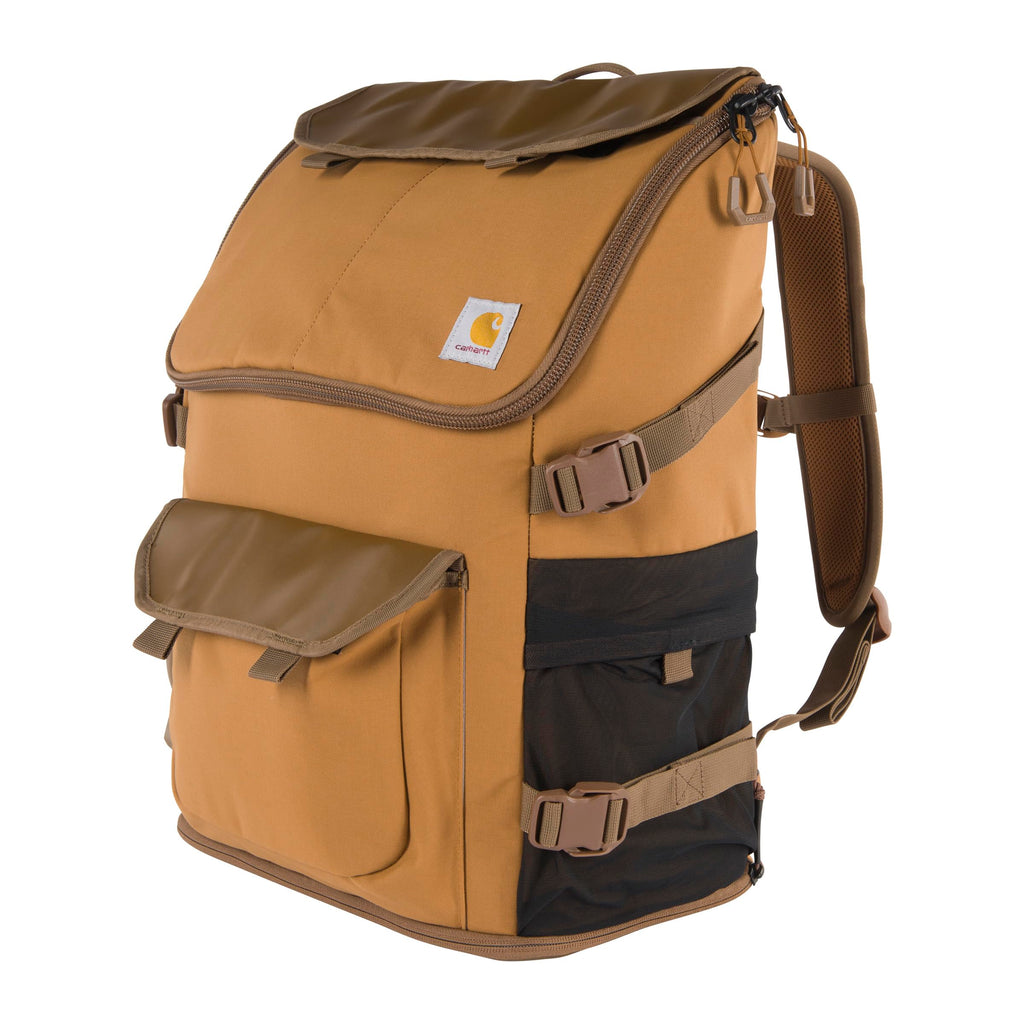Details: Description Carhartt 35L Nylon Workday Backpack. This durable backpack equips you for any type of work day. The large main compartment lets you access all of your essentials while the bottom exterior compartment keeps dirty work gear separate Constructed from 700D Canvas Nylon canvas with rain defender DWR for durability on main body of pack. Coated canvas pocket flaps for weather resistance in key areas A padded, zippered sleeve securely stows up to a 15" laptop and a trolley sleeve on the back panel lets you slide the backpack over the handle of your luggage. Backpack also features vertical double sleeve pockets on outside of main flap, front pocket with key clip, 1 side mesh bottle sleeve, zippered base storage compartment for boots or dirty clothes, 15" padded laptop storage compartment with zipper Padded, accessory- ready shoulder straps, adjustable sternum strap, wide mouth main opening for full visibility of inside complete this durable workday pack