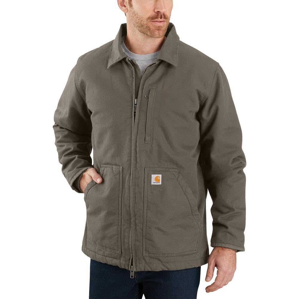 Details: Description This men's lined canvas coat offers legendary Carhartt durability for home, ranch, and farm. A soft sherpa fleece lining in the body adds cold weather comfort, and quilted nylon-lined sleeves slide easily over layers. External and internal pockets keep everyday essentials secure and close at hand. It's cut for a full range of motion. 12-ounce, 100% cotton washed duck. Sherpa body lining for warmth; Quilted nylon sleeve lining for easy on and off. Carhartt-strong, triple-stitched main seams. Under-collar snaps for optional hood. Pleated bi-swing back for extra stretch across the shoulders. Internal rib-knit storm cuffs help keep out the cold. Left-chest pocket with zipper closure. Two large, Sherpa-lined front pockets. Two inner pockets