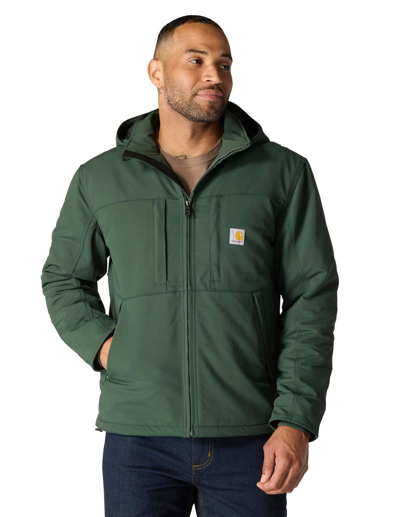 Details: Description Head outdoors in this men's Carhartt jacket that fights off wind, light rain, and cold. Built to move, from ultra-durable stretch nylon that's lighter and more abrasion-resistant than our traditional duck. Featuring 3M™ insulation, an adjustable hood, and plenty of pockets.